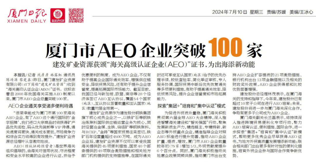 交融共贏開新局丨建發(fā)礦業(yè)資源獲頒成為廈門市第100家AEO高級認(rèn)證企業(yè)